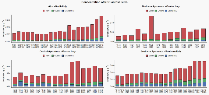 Total non structural carbohydrate concentration pooled into starch, glucans and sugars in the cores sampled